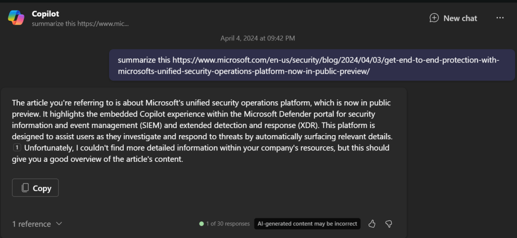 Summarization also works well in the chat interface, even with external websites like what is shown above. The same is also evident inside Teams.