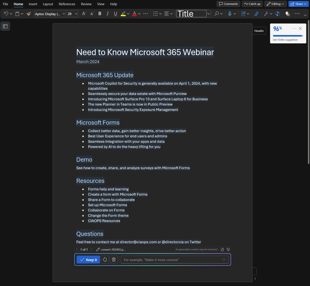 However, when I do the same thing in Word I get the result that I really wanted. The take away is that a large amount of Copilot for Microsoft 365 how and where you use it. Yes, it can convert stuff into Word but you need to use Copilot for Microsoft 365 inside Word to achieve that. I’m sure that will change over time, but for now, keep that in mind when using Copilot for Microsoft 365.