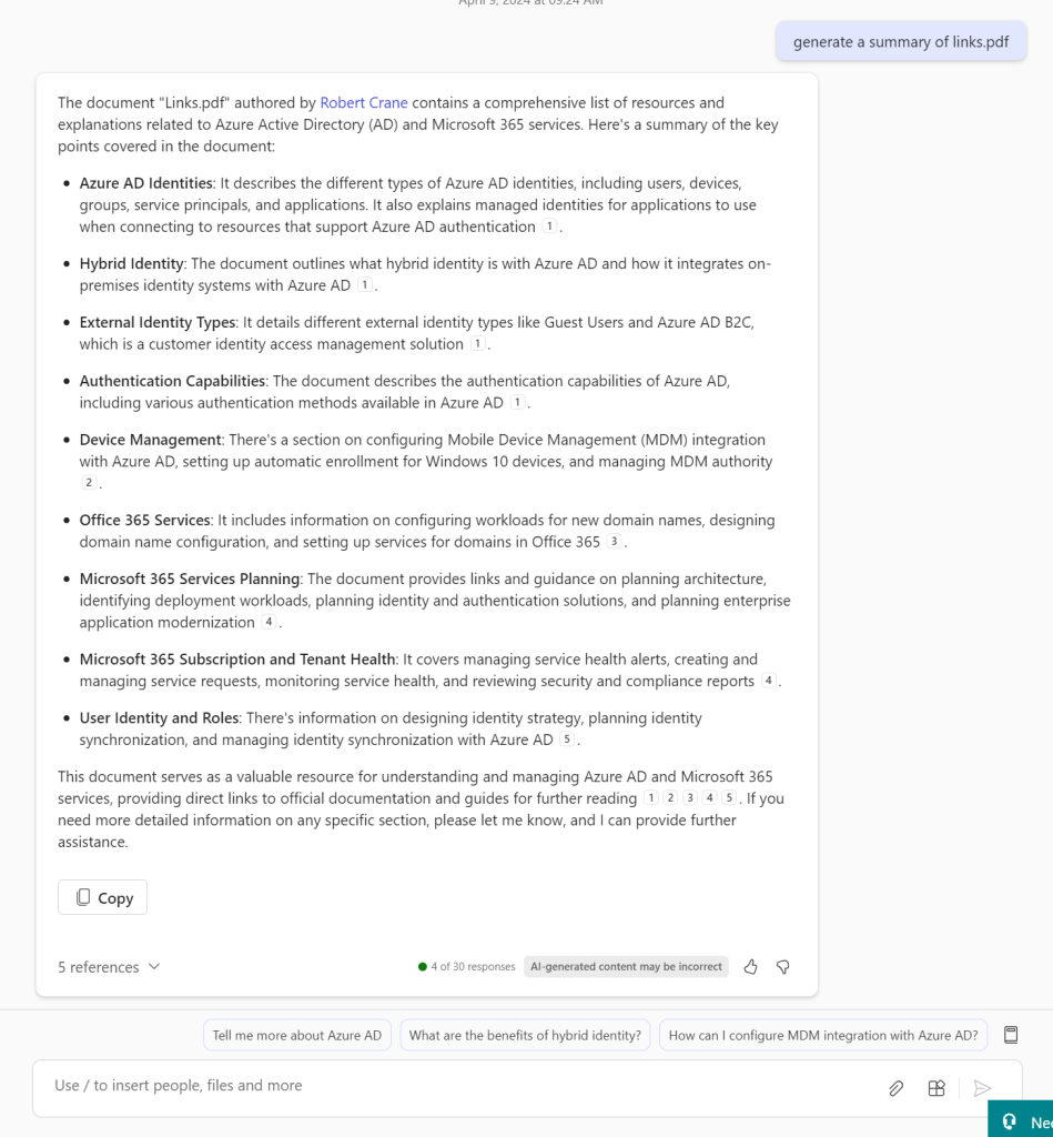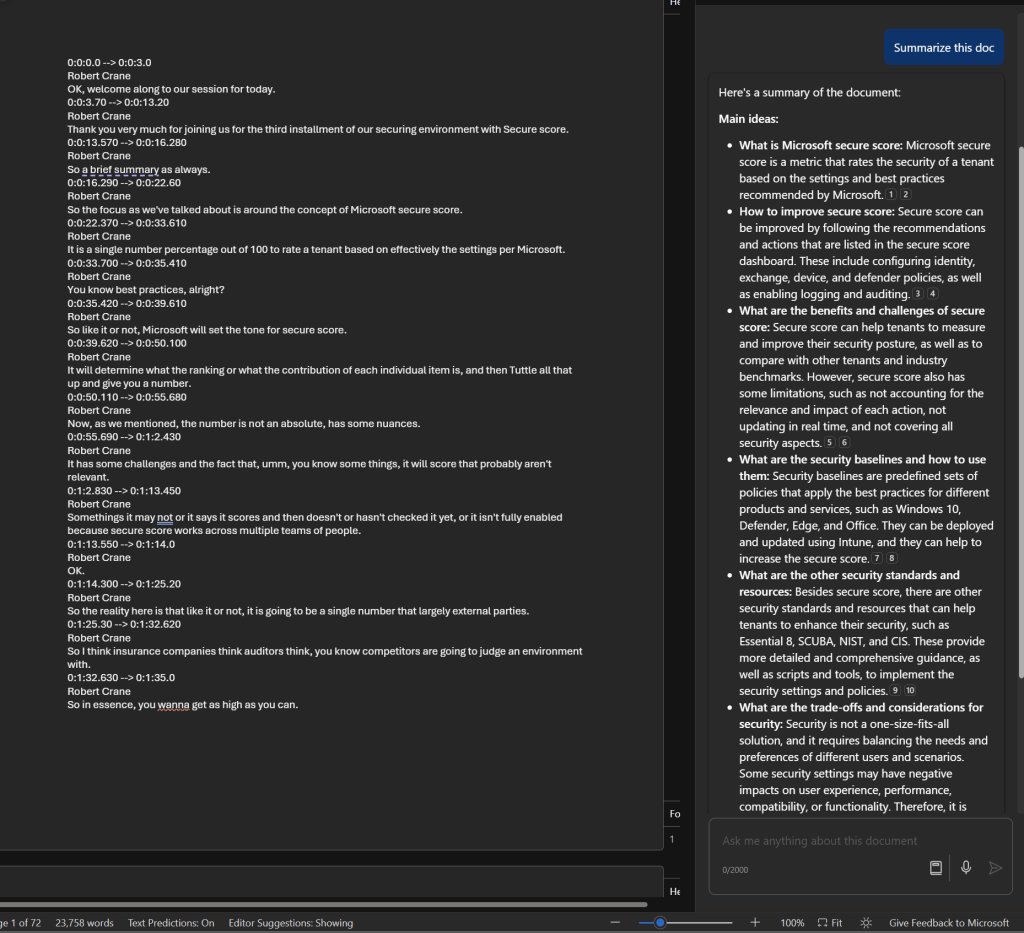 Another area where Copilot for Microsoft 365 really shines is summarizing information as seen above. Here, I’ve had it work on a 72 page document, which was a transcript of a webinar session, and produce the summary.