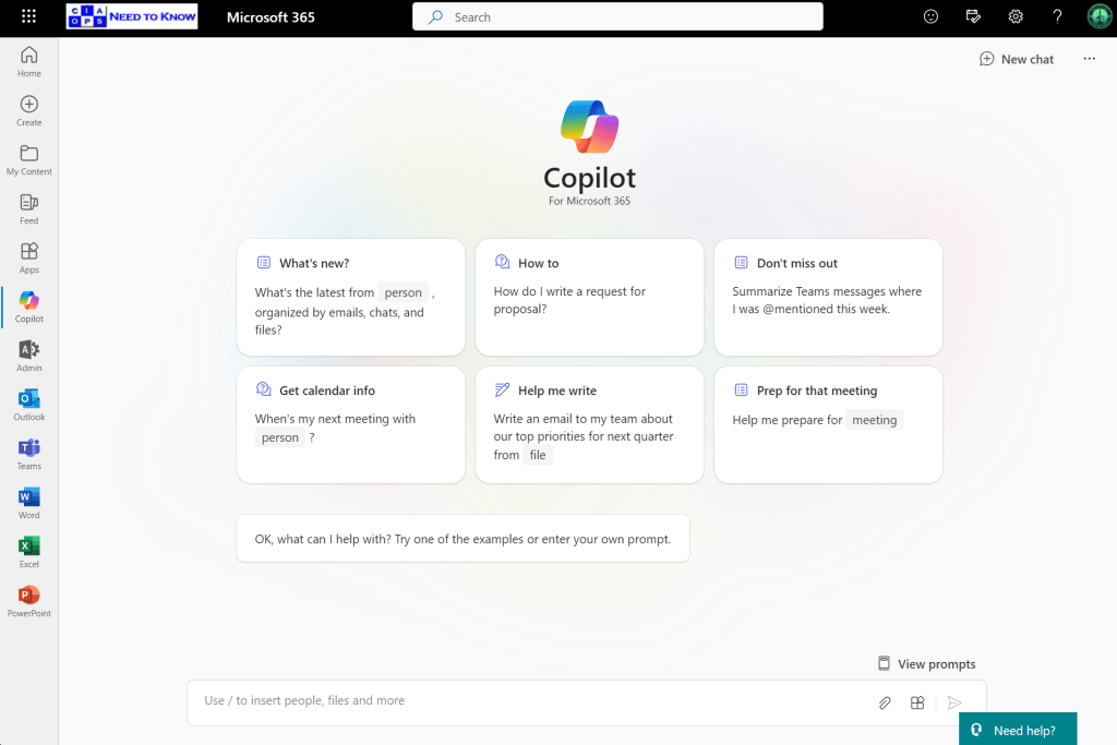 Copilot for Microsoft 365 surfaces itself in a variety of locations in the Microsoft 365 environment. One of those is chat like so: