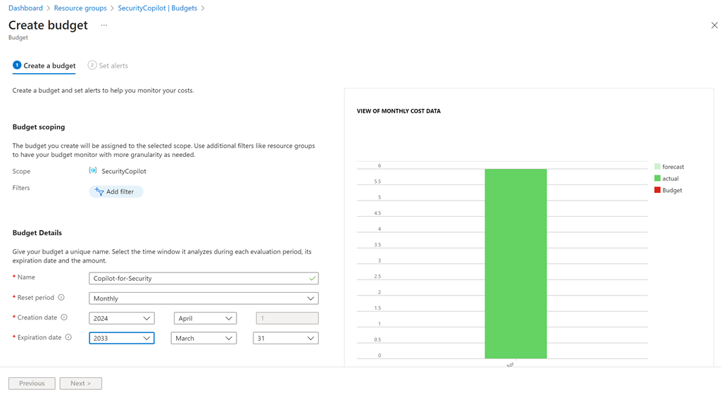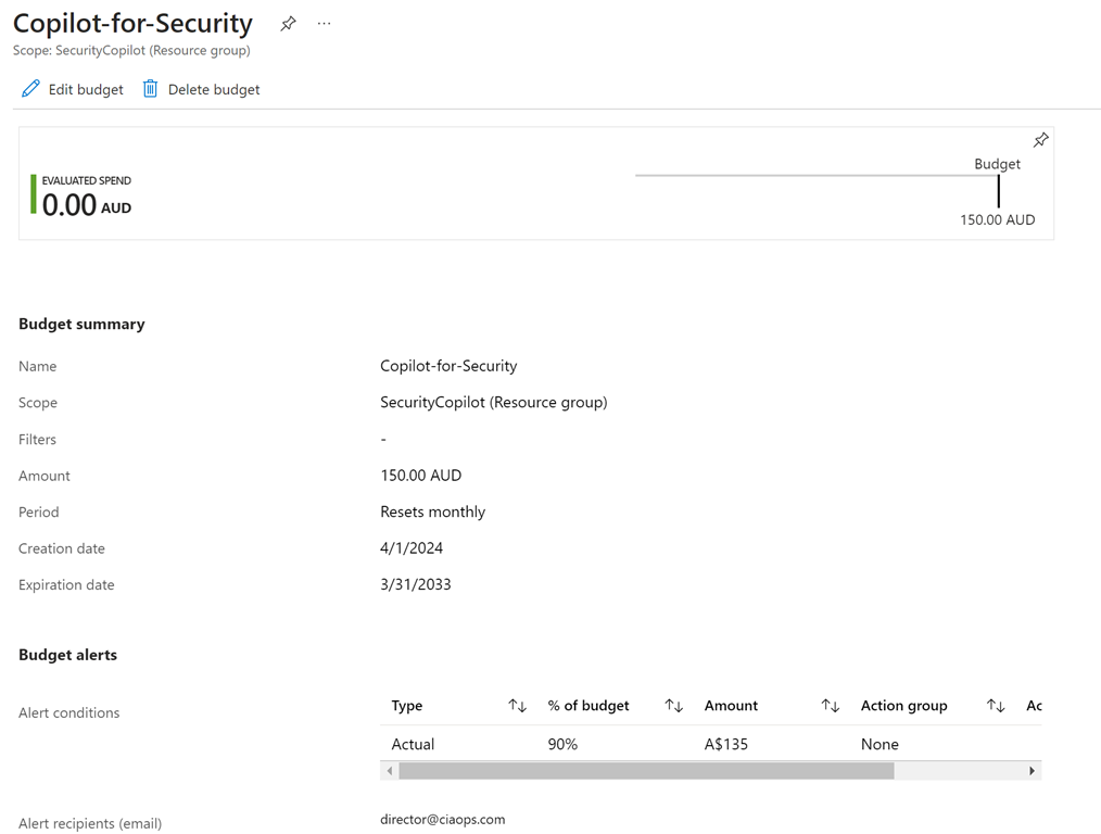 Now, when you exceed the thresholds you set in this budget, you’ll get an email notification that your spending on Copilot for Security has reached the threshold you set.