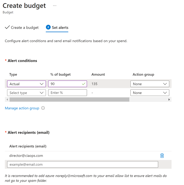 On the next screen you can configure a threshold alert level. Here I set that to 90% of my budget. This means I’ll start getting alerts about Copilot for Security when the cost reaches around $135. You can configure multiple thresholds if you wish.