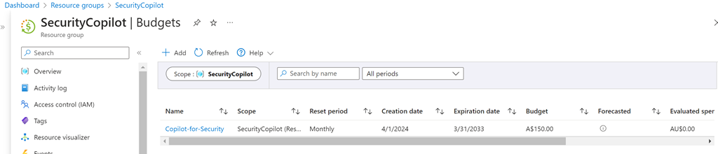 My recommendation is that you configure Copilot for Security in its own Azure Resource Group so that costs and permissions are easier to manage. Inside this dedicated Copilot for Security Resource Group you can attach a budget with notification. To this, navigate to the Azure Resource Group where Copilot for Security is provisioned. Locate the Budgets menu item on the left under the heading Cost Management as shown above. On the right, select +Add from the menu across the top.