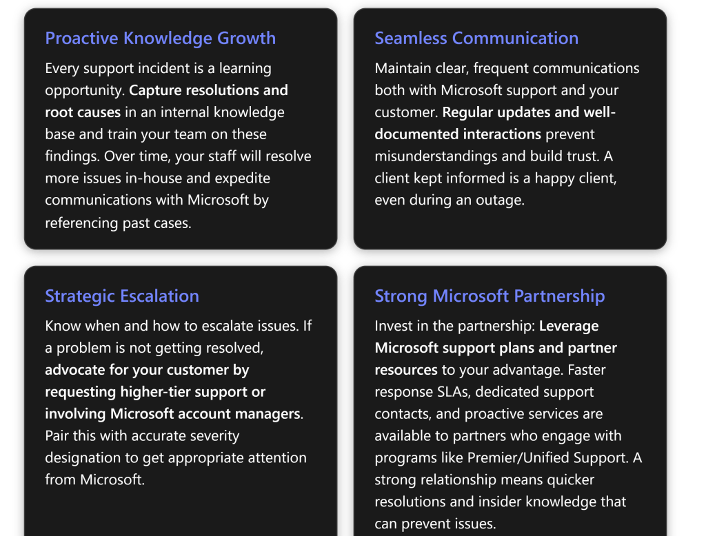 If you often work with Microsoft support, consider setting up regular reviews with Microsoft’s support/account team if available. Some Microsoft support plans (like Premier/Unified Support) offer quarterly service reviews where they look at your cases, patterns, and can advise how to reduce incidents. Even if you don’t have that, as a partner you might have a partner manager who can provide insights or escalation assistance when needed.