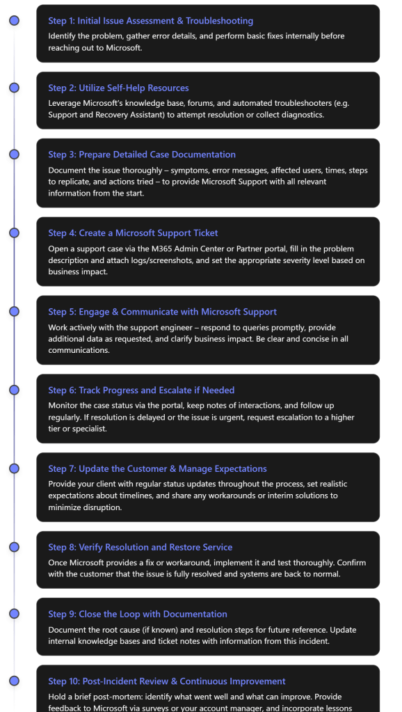Optimizing the support process as an SMB MSP when working with Microsoft is all about preparation, communication, and continuous improvement. By following a structured step-by-step approach – from diligent initial troubleshooting and comprehensive case documentation, through effective engagement with Microsoft support, to thorough resolution verification and post-incident analysis – an MSP can ensure that issues are resolved as swiftly as possible with minimal customer impact.