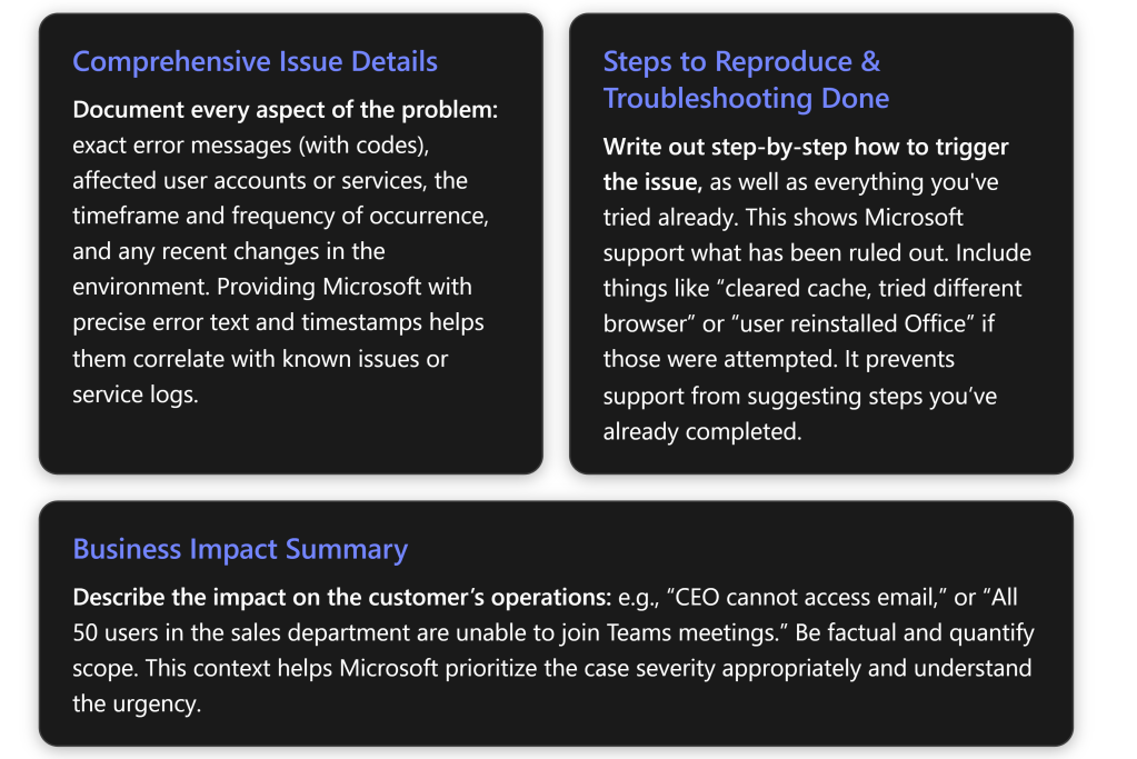 This level of detailed documentation achieves two things: (1) it provides Microsoft the information needed to start troubleshooting immediately, and (2) it demonstrates that the MSP has been methodical, which can instill confidence and lead to more efficient collaboration. When you clearly communicate what you’ve observed and done, Microsoft support can skip asking basic questions and move straight to advanced diagnostics or known issue checks. According to internal guidelines, help desk agents appreciate when you “provide as much detail as possible… all symptoms, error messages, exact steps to reproduce, and any troubleshooting already completed”[1][1] up front.