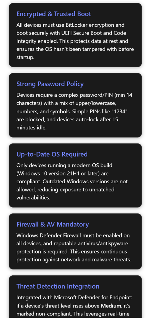 Defender for Endpoint might mark risk as Medium for something like “OS version is two updates behind” or “phishing site access attempt detected” – with this compliance policy, those events would push the device out of compliance immediately. This is a very security-conscious stance: it leverages Microsoft’s threat intelligence on the device’s state in real time. It’s analogous to having an agent that can say “this phone might be compromised or misconfigured” and acting on that instantly.