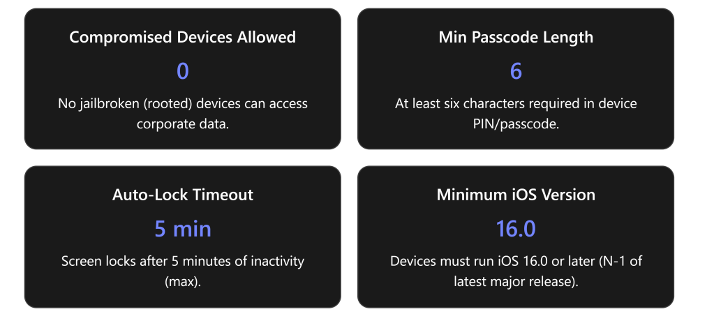 One challenge: older devices that cannot update to newer iOS will fall out of compliance. This is intended – such devices likely shouldn’t access sensitive data if they can’t be updated. However, it may require exceptions or phased enforcement if, say, some users have hardware stuck on an older version. In a maximum security mindset, those devices would ideally be replaced or not allowed for corporate use.