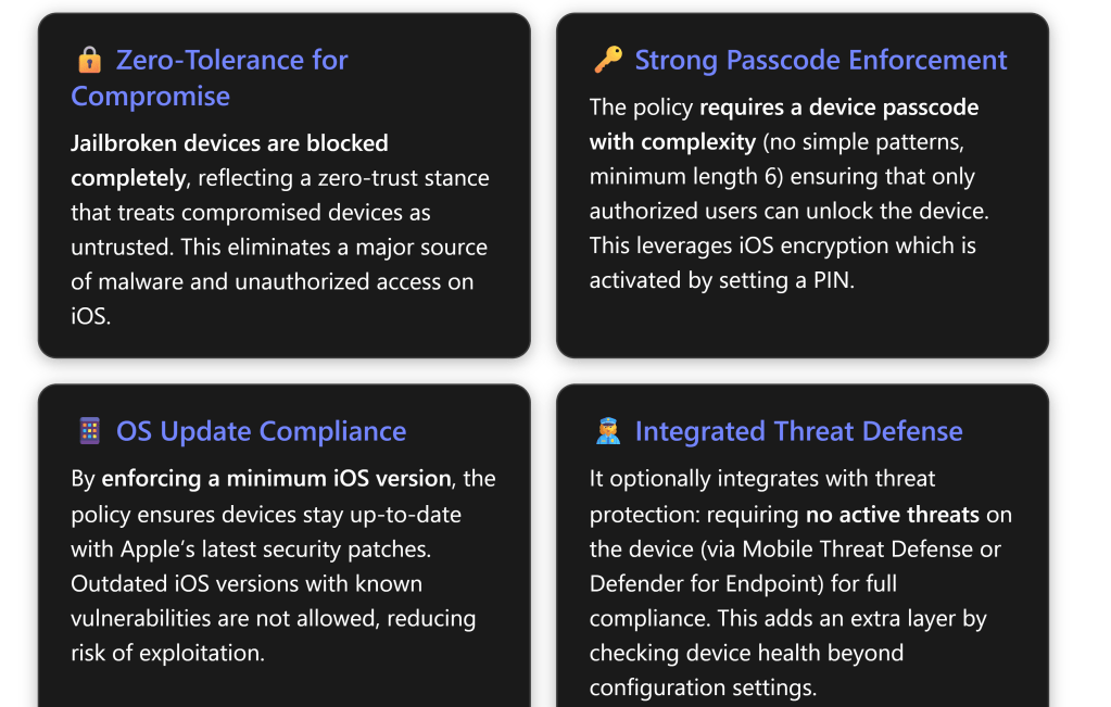 Combining MDE risk with the earlier MTD setting might sound redundant, but some organizations use one or the other, or even both for layered security. (Defender for Endpoint can serve as an MTD on iOS in many ways, though iOS’s version of MDE is somewhat limited compared to on Windows – it primarily focuses on network/phishing protection and compliance, since iOS sandboxing limits AV-style scanning.)