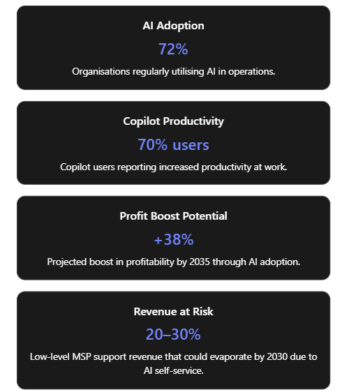 - Commoditisation of Basic Services: Over the long term, many basic IT support services are likely to become commoditised or bundled into software. For instance, routine monitoring, patch management, and straightforward troubleshooting might be almost entirely automated by AI systems. Microsoft and other vendors are increasingly building AI “co-pilots” directly into their products (as indicated by features rolling out in tools by 2025), allowing end-users to self-serve solutions that once required an MSP’s intervention[5][5]. As a result, MSPs may find that the traditional revenue from things like alert monitoring or simple ticket resolution diminishes. In fact, experts predict that by 2030, about a quarter of the current low-complexity ticket volume will vanish – either resolved automatically by AI or handled by intuitive user-facing AI assistants[5]. This means MSPs must prepare for possible pressure on the classic “all-you-can-eat” support contracts, as clients question paying for tasks that AI can do cheaply[5]. We may see pricing models shift from per-seat or per-ticket to outcome-based agreements where the focus is on uptime and results (with AI silently doing much of the work in the background)[5].