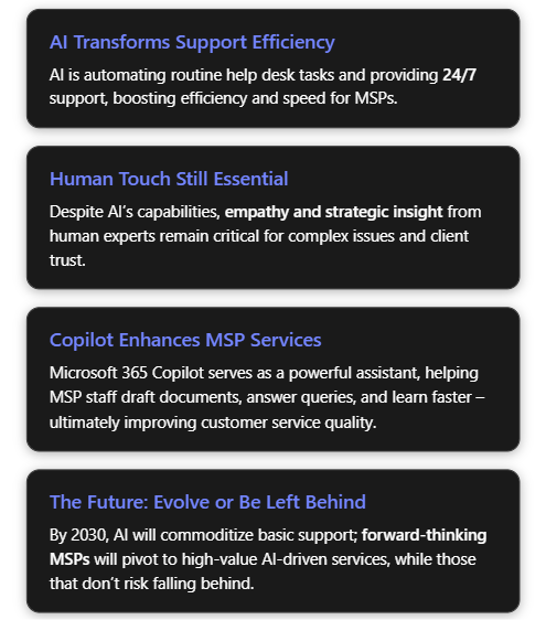 In summary, the long-term impact of AI on MSP support is a shift in the MSP value proposition rather than a demise. Routine support chores will increasingly be handled by AI, which is “the new normal” of service delivery. Simultaneously, MSPs will gravitate towards roles of AI enablers, advisors, and security guardians for their clients. By embracing this evolution, MSPs can actually improve their service quality and deepen client relationships – using AI not as a competitor, but as a powerful ally. The MSP of the future might spend less time resetting passwords and more time advising a client’s executive team on technology strategy with AI-generated insights. Those who adapt early will likely lead the market, while those slow to change may struggle.