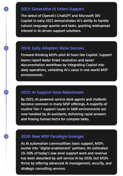 Looking ahead, the influence of AI on MSP-provided support is only expected to grow. Industry observers predict significant changes in how MSPs operate over the next 5–10 years as AI technologies mature. Here are some key projections for the longer-term impact of AI on MSPs and their help desks: