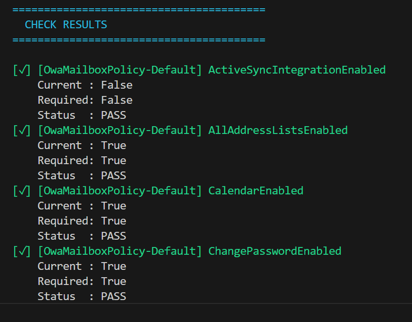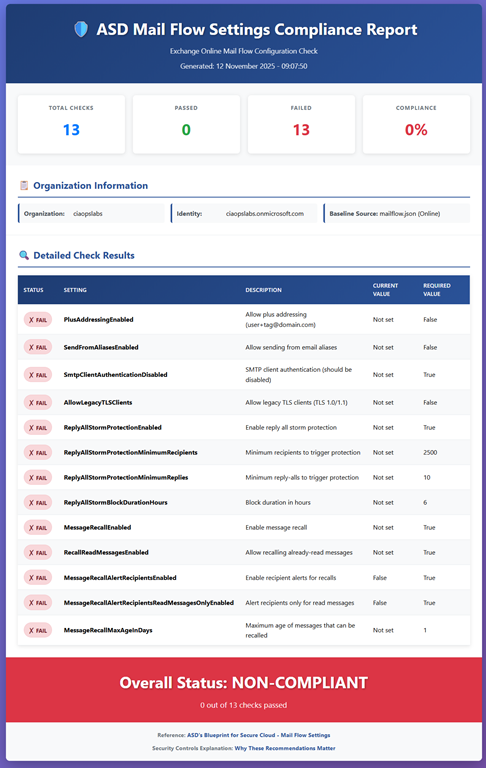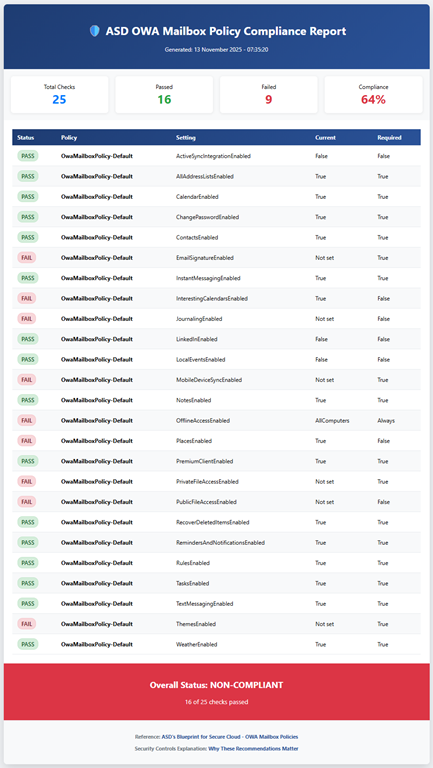 that reads the online JSON file (or uses a local version if you want to use that) and compares the recommended ASD settings to those in your own Exchange Online environment. Note, the script makes NO CHANGES to your environment, it simply reads the current settings.