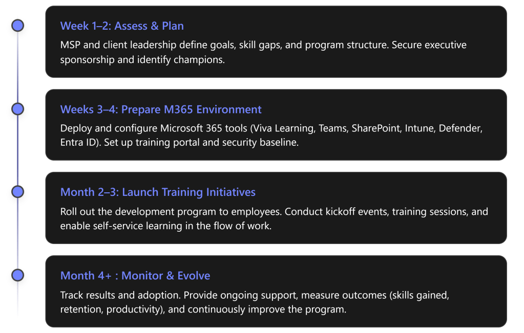 Step Seven of the MSP priorities (“Investing in Workforce Development and Talent”) emphasizes building a skilled, engaged, and loyal workforce. The following is a step-by-step implementation program for MSPs to help their SMB clients achieve these outcomes using Microsoft 365 Business Premium. It is organized into phased actions with clear timelines, assigned roles, and measurable outcomes, leveraging tools like Viva Learning, Teams, SharePoint, Intune, Defender, and Entra ID.