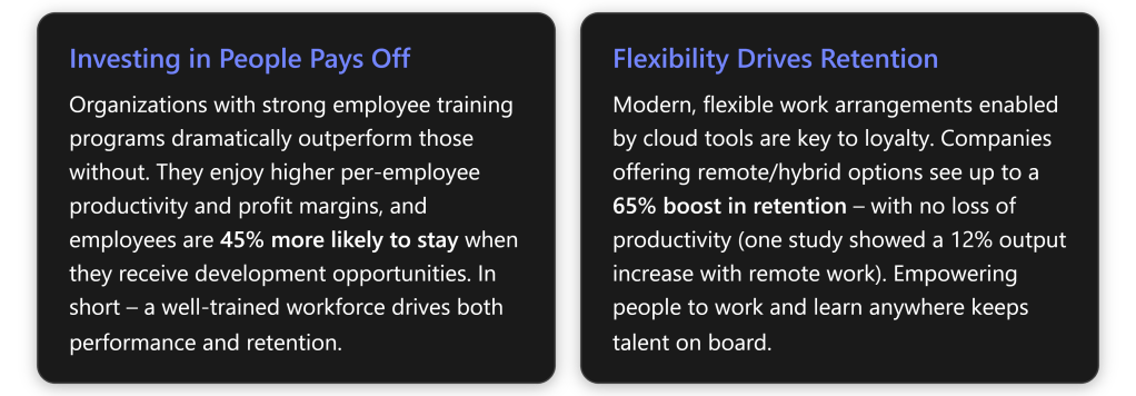 | Intune (Endpoint Manager) | Device management for flexible learning: Ensures every user device is secure, compliant, and pre-loaded with required apps. Enables remote and hybrid work by managing endpoints and protecting data. Outcome: a reliable technical environment where employees can learn/work from anywhere safely, which supports retention through flexibility. |
