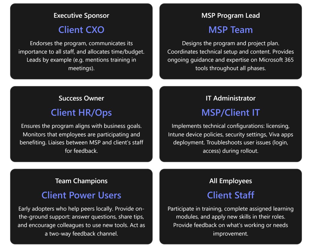 - IT Lead (either the MSP or client’s IT admin) – to oversee technical setup of M365 features.