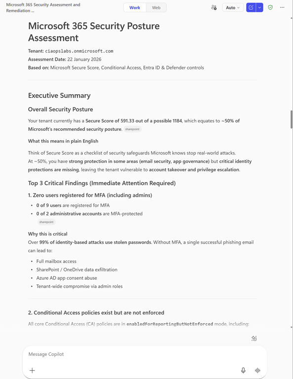 In that example, I use my own agent developed in Azure AI Foundry to analyse security data extracted from Microsoft 365. In there I did offer free access to the script and my Foundry AI agent for analysis. However, I do appreciate that many people are hesitant to allow a ‘foreign’ AI system to evaluate private M365 security data.
