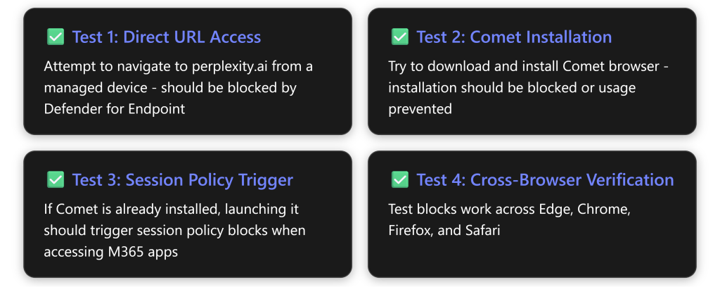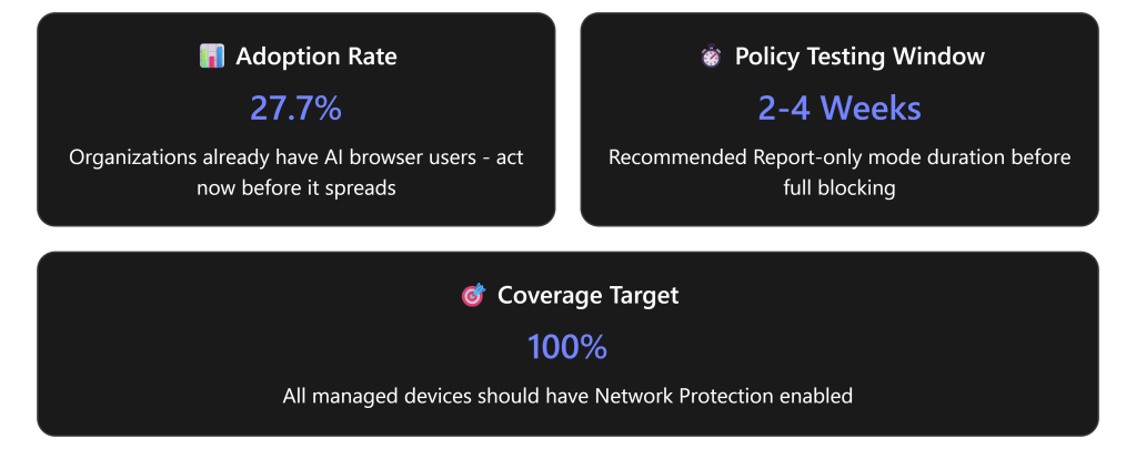 - User Education is Critical: Technical controls must be paired with clear communication about why AI browsers pose risks and what alternatives are approved