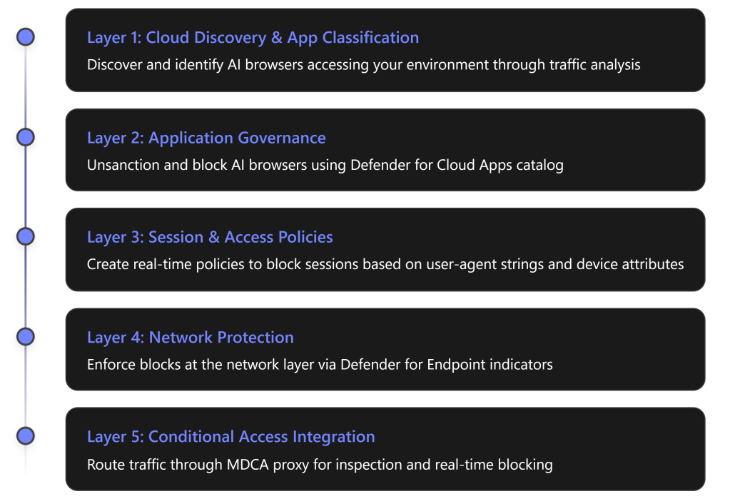 Blocking AI browsers requires a comprehensive, defense-in-depth approach using multiple Microsoft 365 security layers: